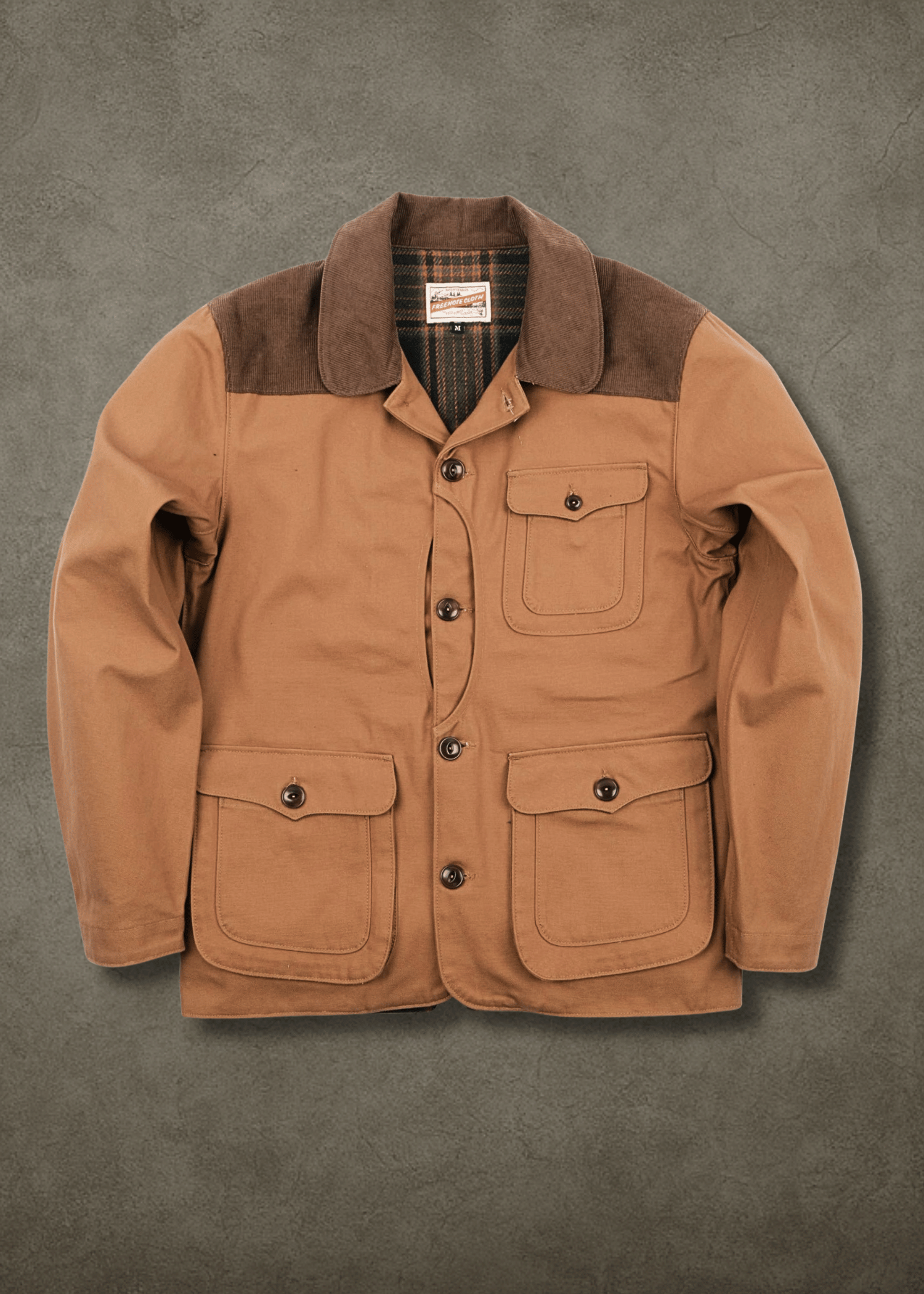Built from 10‑ounce Japanese duck canvas with a contrast corduroy collar and yoke. An action‑back with hidden elastic adds mobility, while hunting‑inspired double patch pockets, rear game pockets, and bellowed storage keep it functional. Finished with 1/8" double‑needle stitching, custom corozo fisheye buttons, a U.S.-made label, and 100% cotton construction.