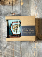 Patterned after a true Pendleton original, this generously sized ceramic mug holds 18 ounces of your favorite brew with ease. Standing 4 inches high, it’s built sturdy and dependable, just like a well-worn ranch fence. Dishwasher and microwave safe, it arrives boxed and ready to gift, or to keep close for the long hauls ahead.
