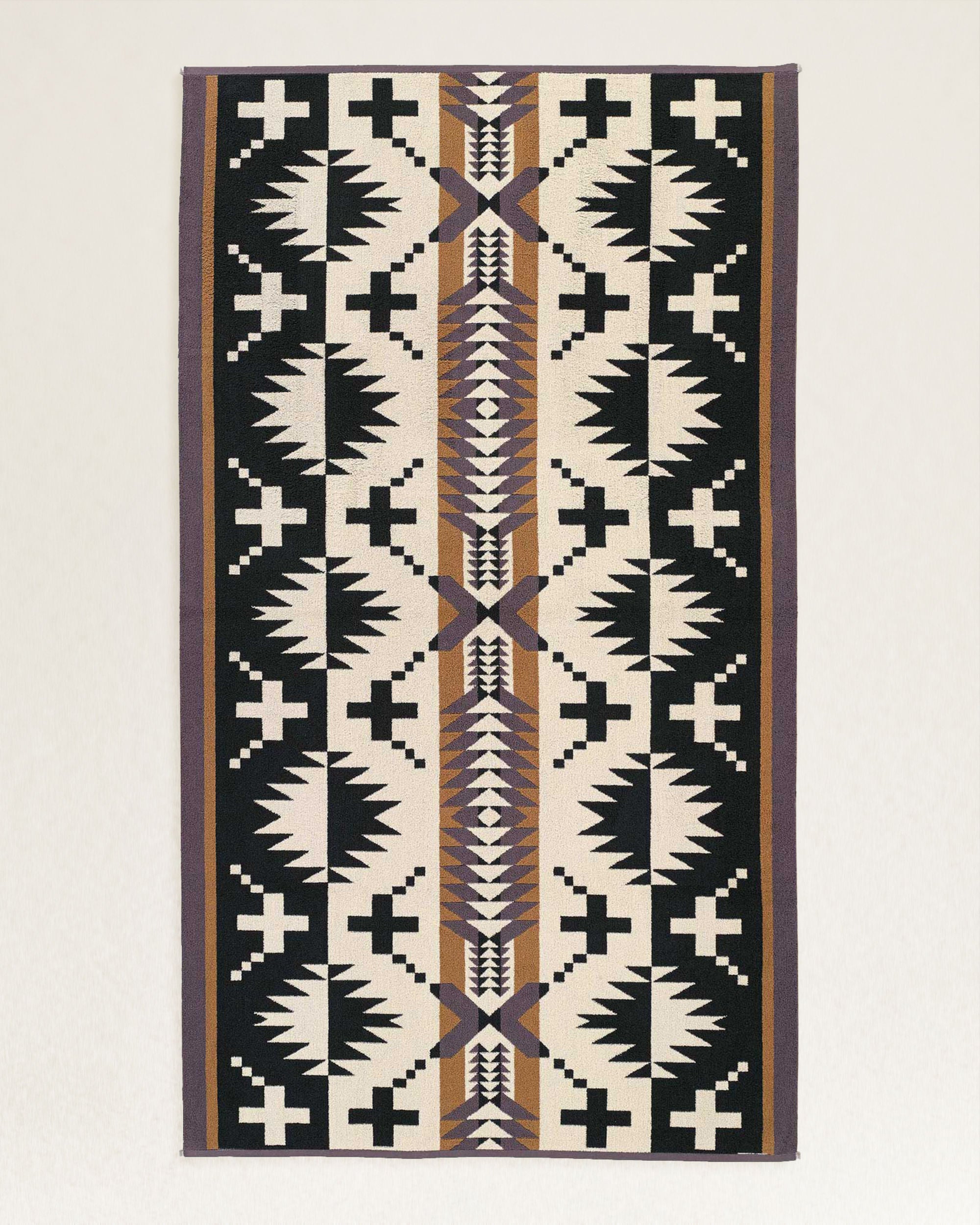 A dynamic blanket pattern re-created in a supersized towel for beach, poolside or hot tub—or an instantly luxurious bathroom. Thirsty cotton velour is sheared on one side for luxurious softness, looped on the other for superior absorption.