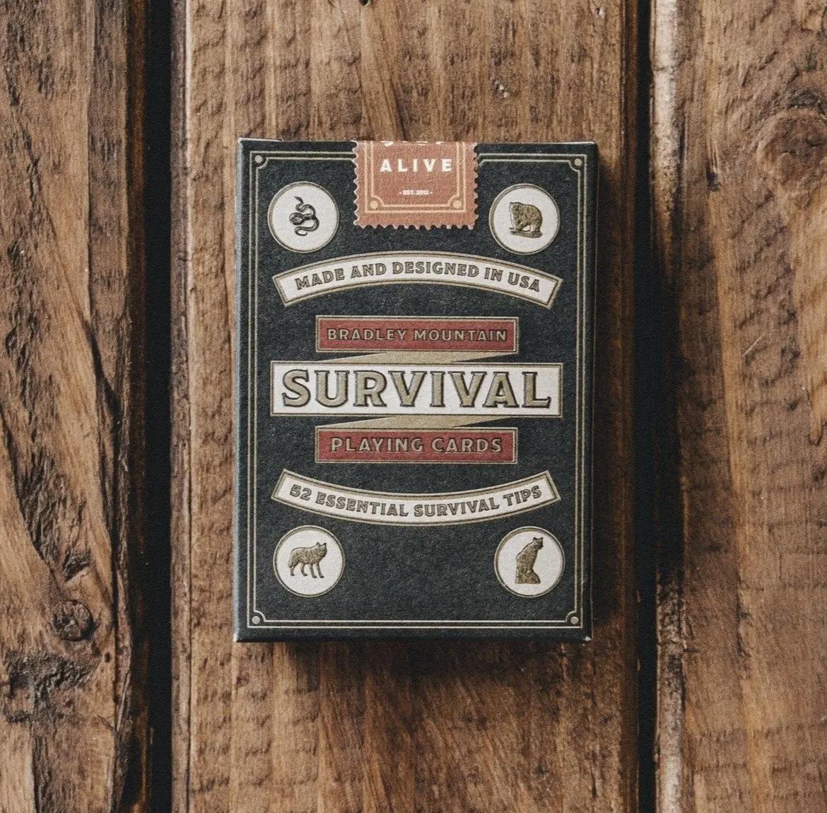 The Survival Playing Card Deck. Every card is unique with its own survival tip (52 in total). Each illustration was hand drawn by Andrew Nguyen (one of our craftsmen and graphic designers). Printing in the USA by the American Playing Card Company, these cards are poker quality. Letter press box was done by Clove St. Press locally in San Diego with a 5 pass process.