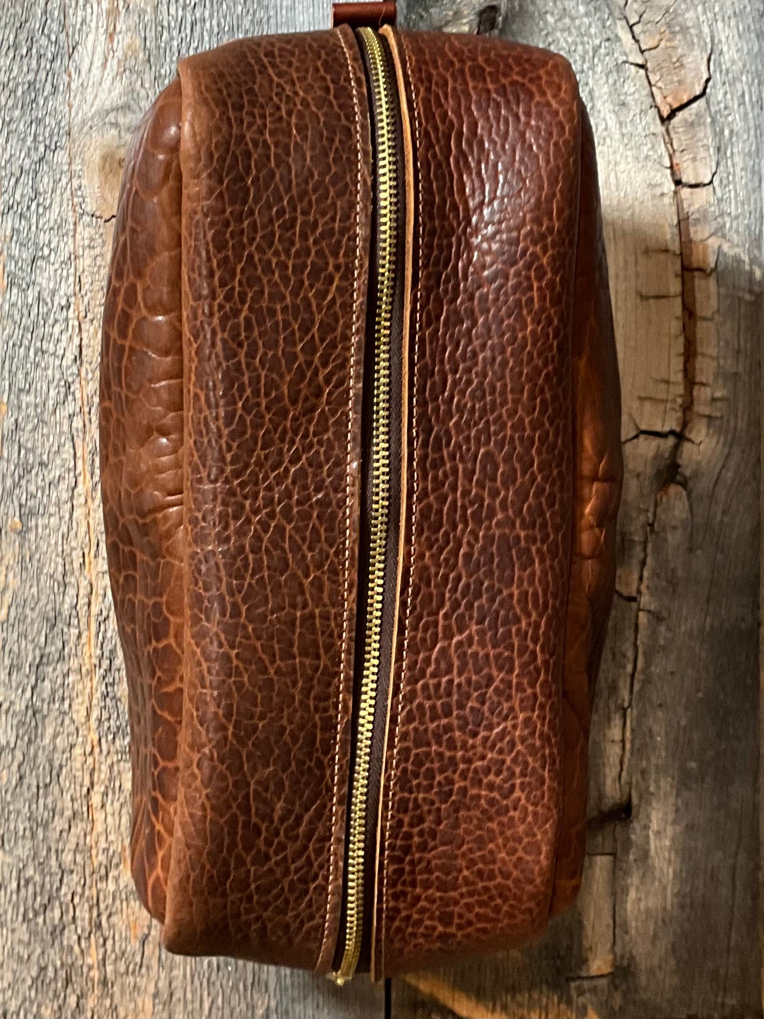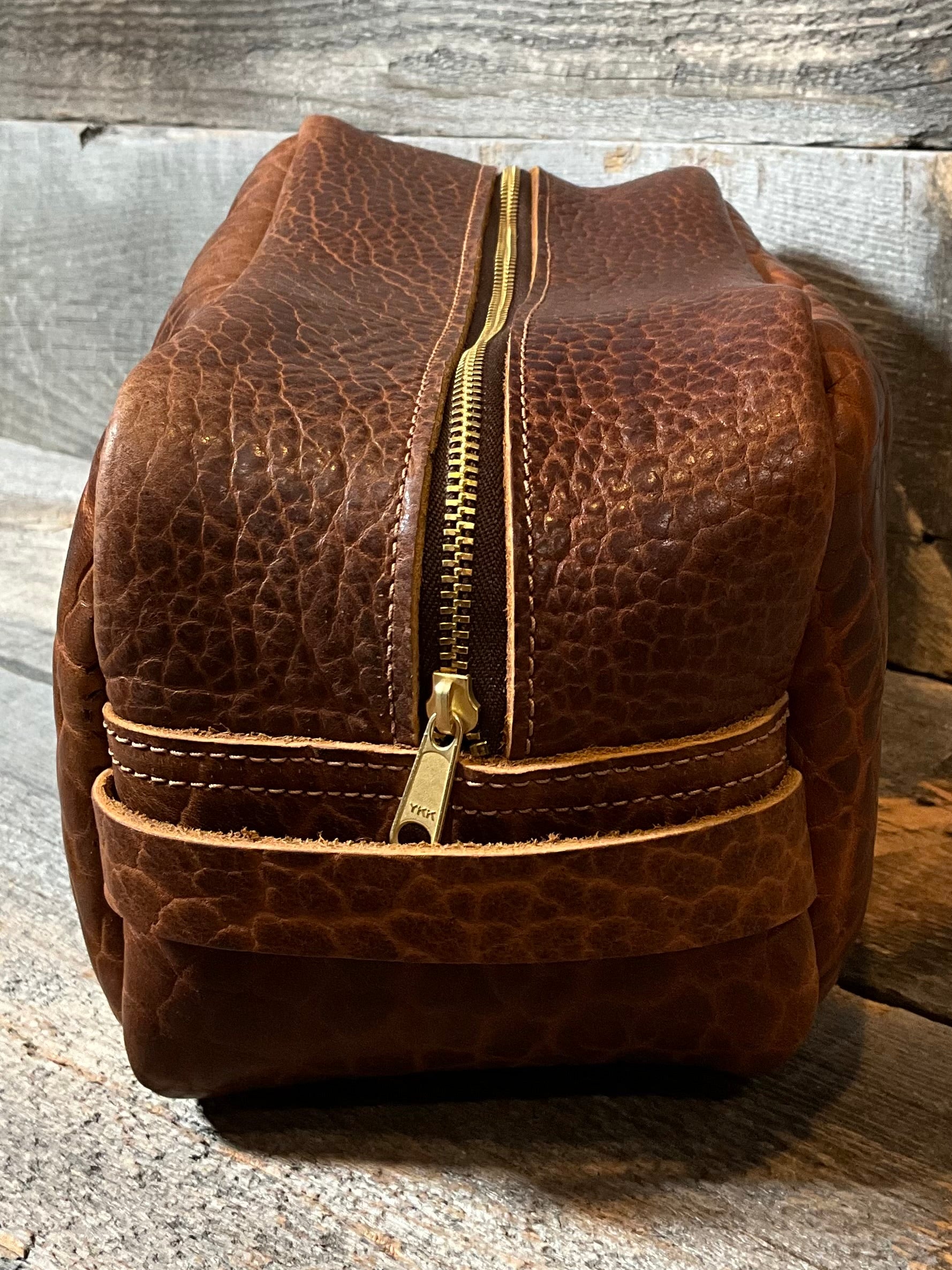 Upgrade your travel accessories with the timeless Bison Standard Dopp Kit No. 2006. Made in the U.S.A. from premium 6oz shrunken Bison leather, this durable kit boasts a YKK brass zipper and a simplistic design for easy access to your essentials. Say goodbye to cluttered toiletry bags with this sleek and functional storage solution.