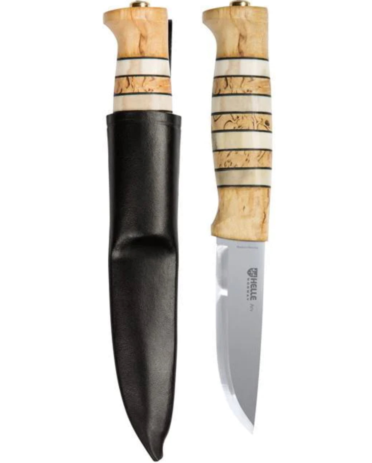 The knife has a small but distinct finger guard and a medium size blade of the finest triple laminated Helle steel. Shaped with a scandi edge and sharpened by hand to a razor-sharp edge.