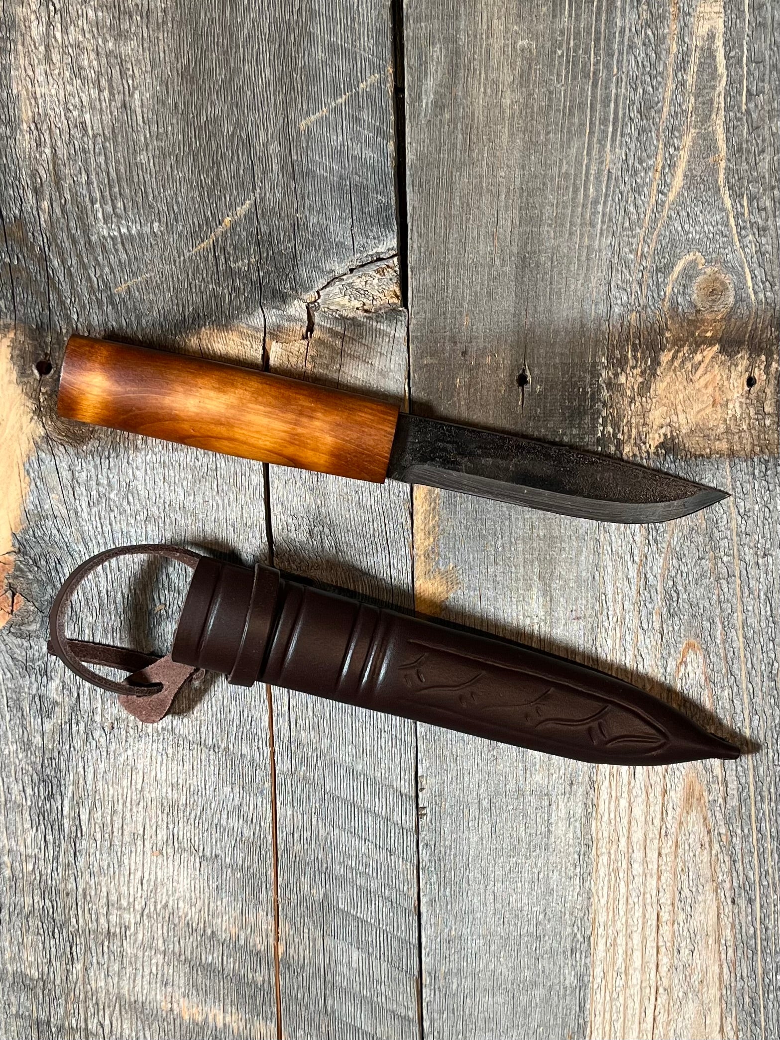 The Viking’s the kind of blade that feels older than words but sharp as the day is long. Built off a classic design meant for a longship journey ‘round the world, it’s got a thick carbon steel blade that means business and keeps a bit of that fire-dark finish from heat treat. The tang runs deep, all the way through curly birch that’s shaped simple and strong, with a grip that feels right, even without contour.