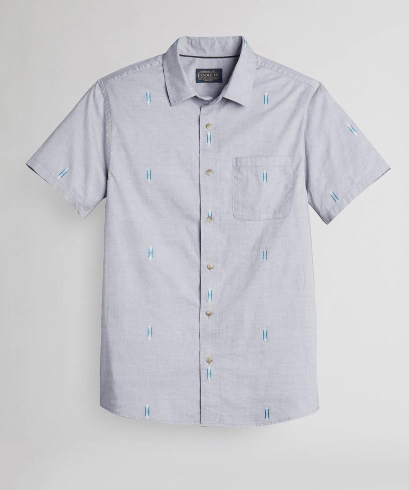Lightweight cotton men's shirt in a dobby weave with jacquard-inspired motifs. Spread collar, one matched open chest pocket, shirttail hem.