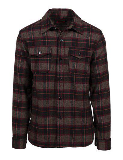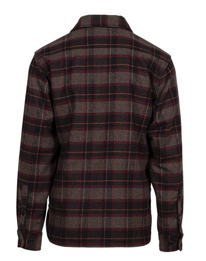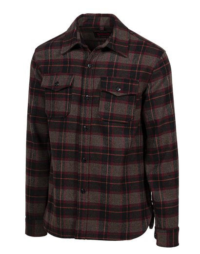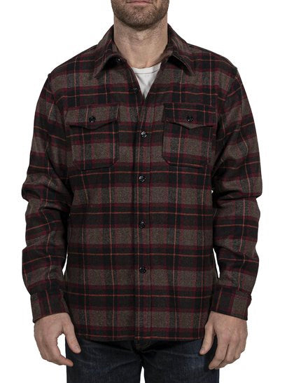 30” 20 oz plaid wool blend unlined CPO shirt features mini anchor button front closure, two upper front pockets and button cuff closure.
