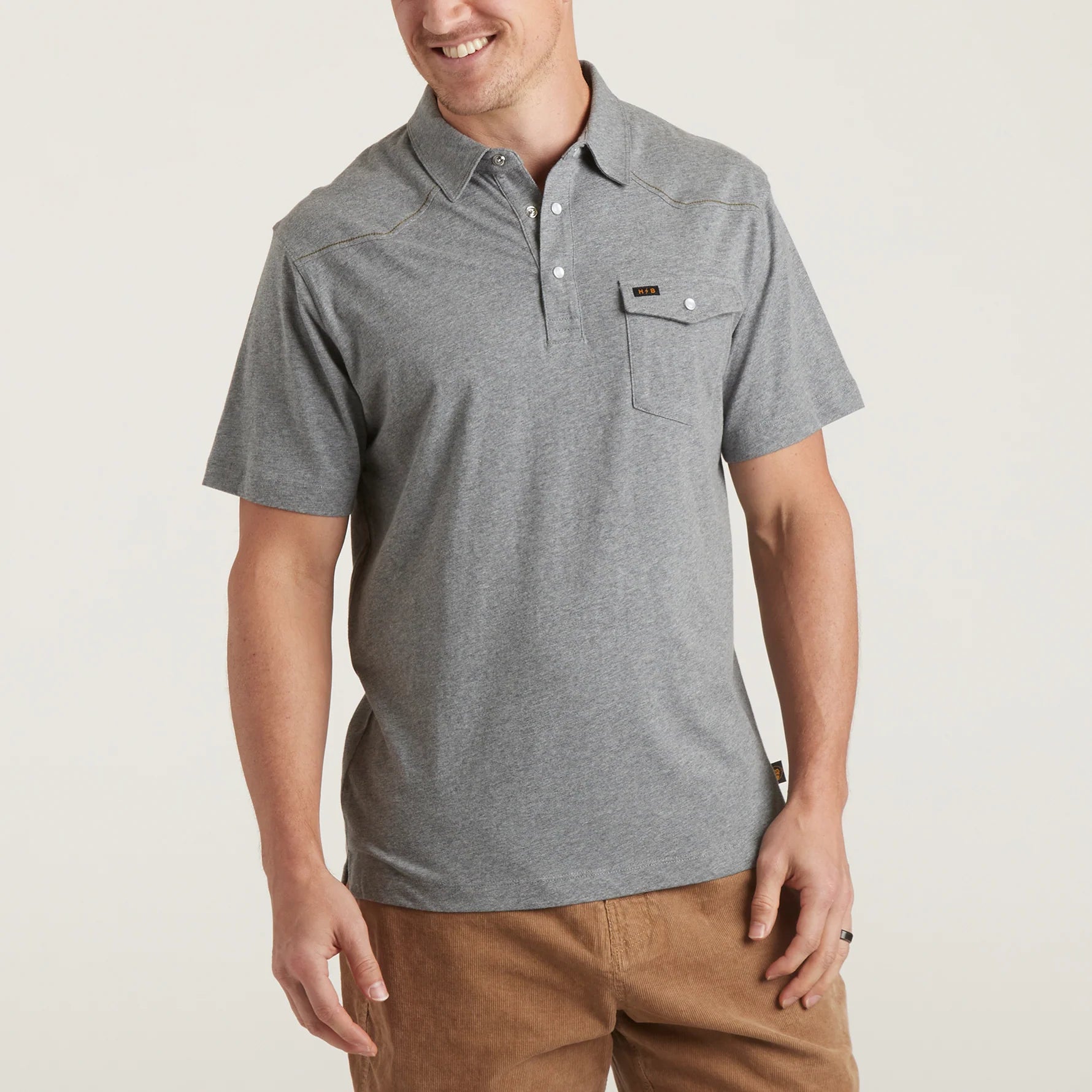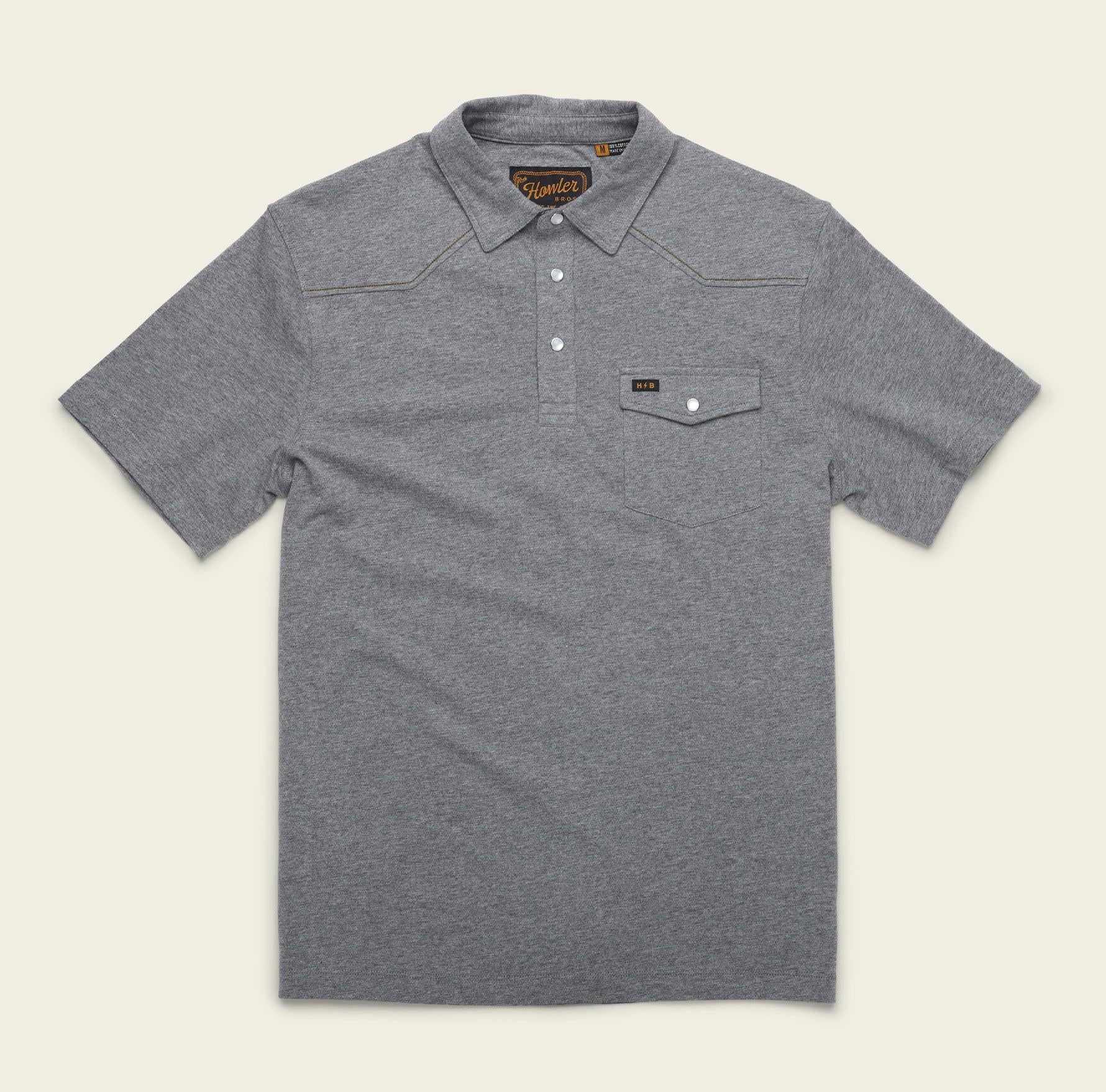 The Ranchero Polo has all the versatility of your favorite staple polo but is a major style upgrade with its cool single pocket design, pearl snaps and subtle western style yoke. Made of super soft 100% heathered cotton you have come to expect from Howler with a straight hem for untucked wear.Ranchero Polo - Deep Grey Heather