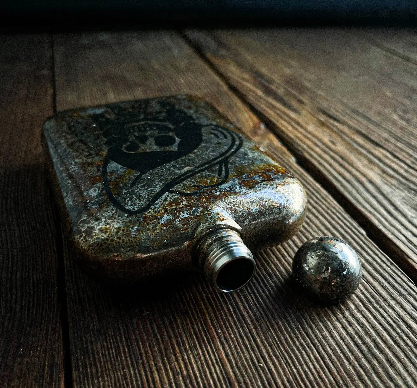 6 oz stainless steel with etched embellishments atop classic patina