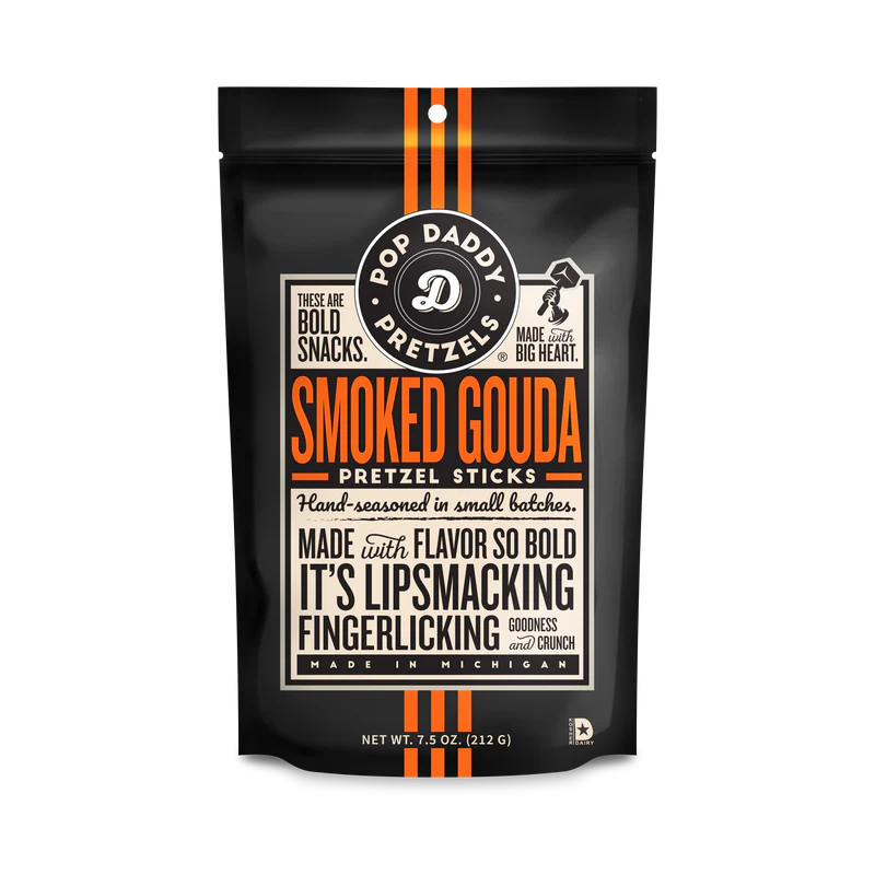 Indulge in Pop Daddy Snacks' Smoked Gouda Seasoned Pretzels for a buttery, creamy smooth snack with a bold and nutty flavor. Made with real smoked Gouda cheese, these pretzels are best served at room temperature and have no artificial colors or flavors. Plus, the resealable bag makes them perfect for sharing (or not).