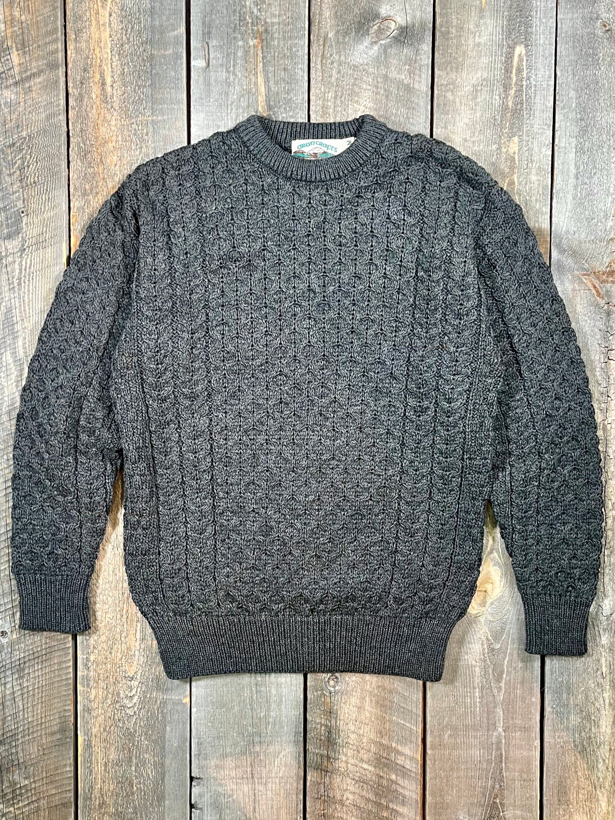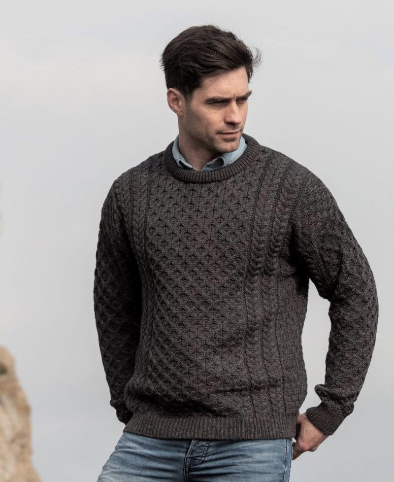 This Traditional Irish crew neck sweater is one of Aran Crafts greatest sellers. It follows all the Traditional Irish Aran stitching patterns that have been passed down from generation to generation, which in olden days told stories of families and life in Ireland. Along the centre panel of the body the honeycomb Aran stitch flows, signifying the hard working bee or the hard work of a fisherman. On either side of this centre panelling there are rows of Irish cable Aran stitches resembling the fishermans ropes, the link to life. This jumper tells a story through Irish knitting.
