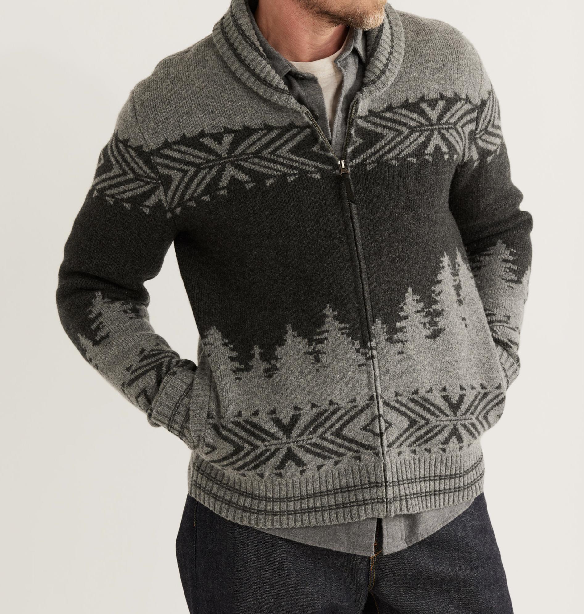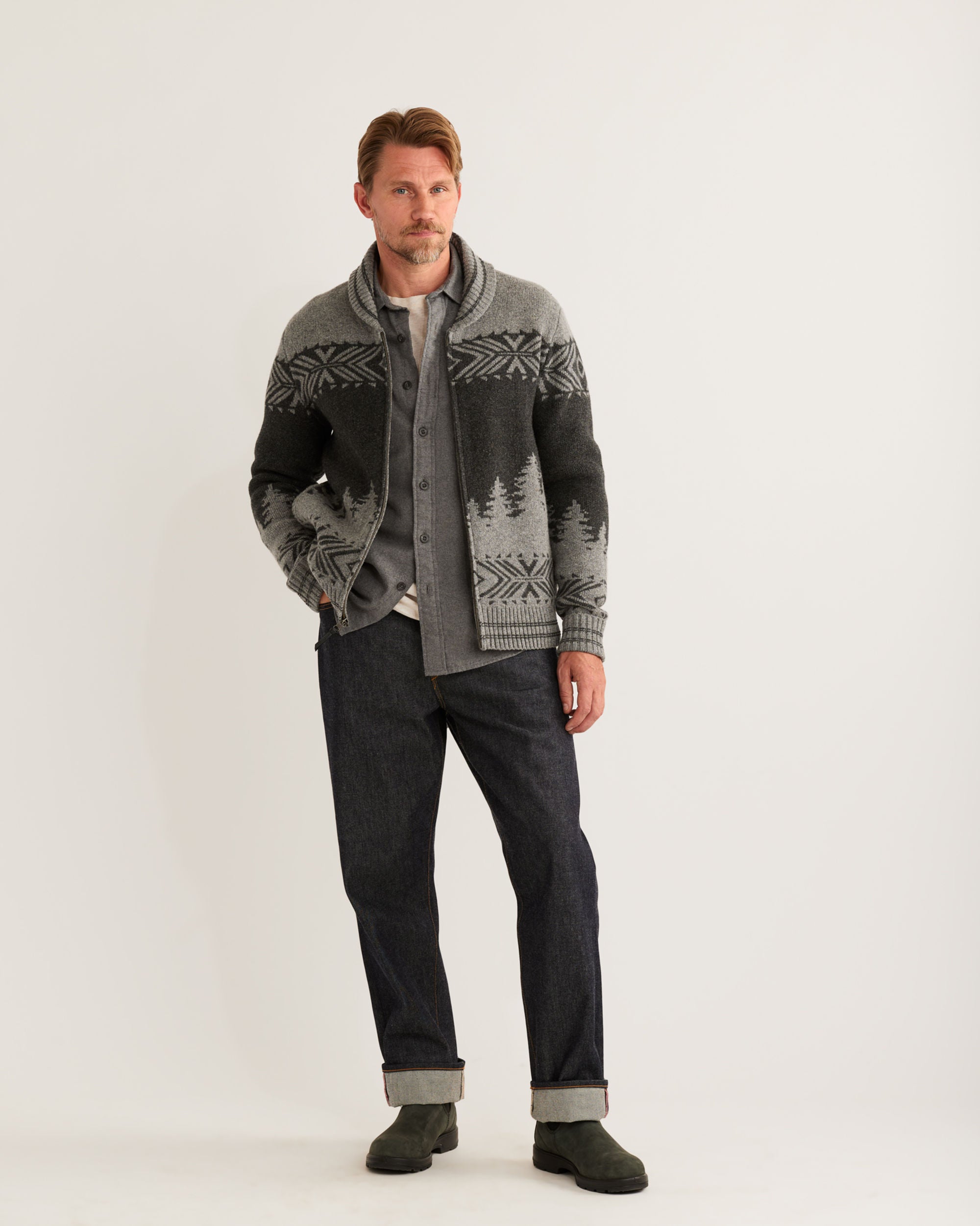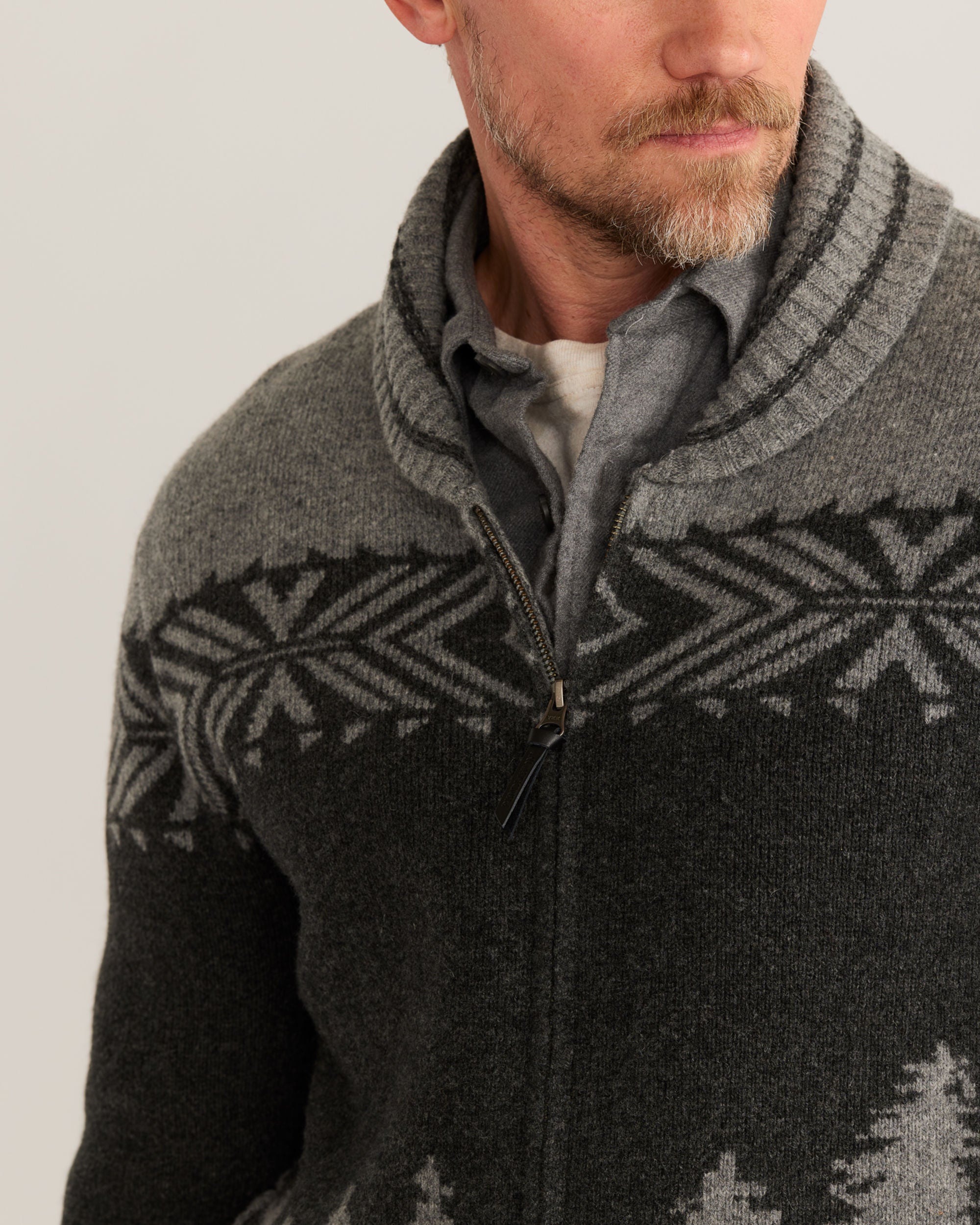 A tribute to Oregon’s iconic mountain peak, this zip cardigan features towering evergreens on the body and sleeves, with a silhouette of Mt. Hood on the back. Ribbed shawl collar, cuffs, hem and pockets. Leather zipper pull.