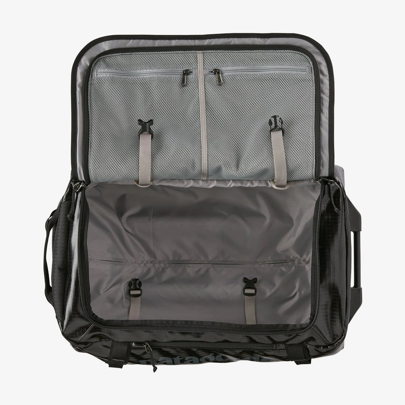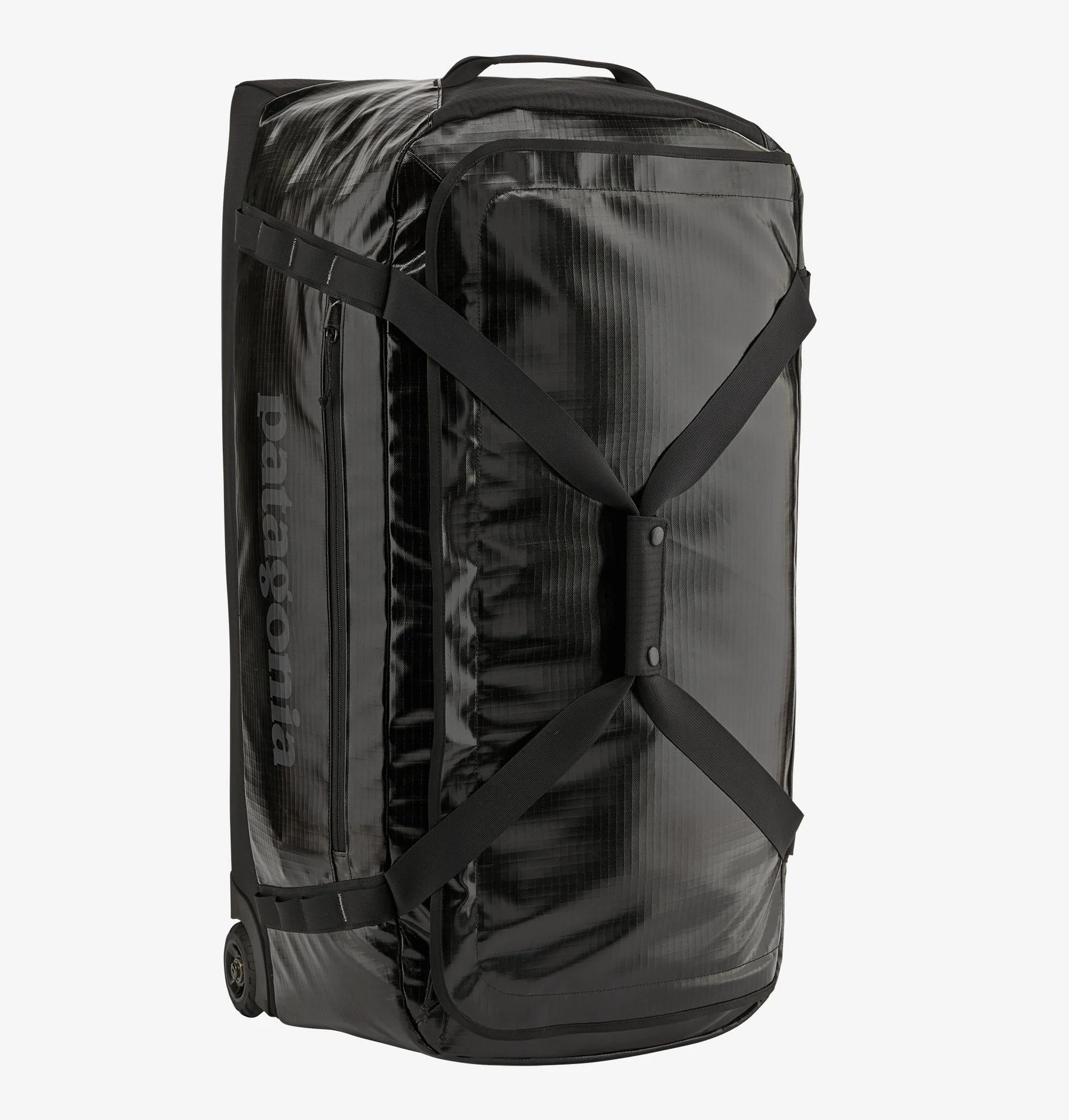 A highly weather-resistant 100-liter gear hauler with sturdy wheels and a telescoping handle. Made with 100% recycled body fabric, lining and webbing.