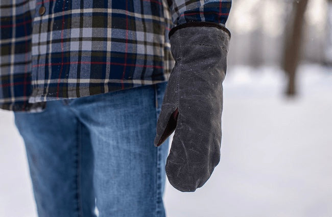 When it's even more wet than cold, try the waxed cotton version of our Tough Mitts. The paraffin-treated outer resists water, the leather palm and fingers ensure durability, and the sherpa lining keeps in the warmth.